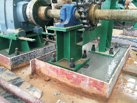 (1)基礎(chǔ)處理:清掃設(shè)備基礎(chǔ)表面,不得有碎石、浮漿、灰塵、油污和脫模劑等雜物。灌漿前24h,設(shè)備基礎(chǔ)表面應(yīng)充分濕潤。灌漿前1h,應(yīng)吸干積水。