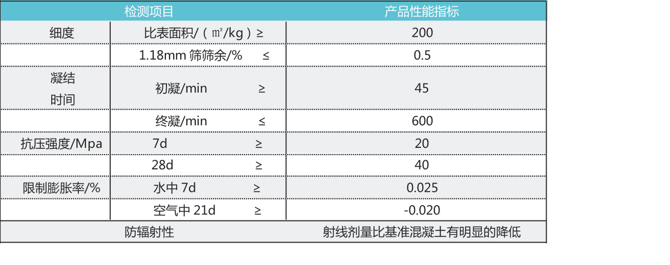 技術(shù)指標符合GB23439-2009《混凝土膨脹劑》、JC474-2008《砂漿、混凝土防水劑》和GB/T4835-2008《輻射防護儀器β、×和y輻射周圍和/或定向劑量當(dāng)量(率)儀和/或監(jiān)測儀》標準中相應(yīng)的技術(shù)指標。本產(chǎn)品能有效降低防輻射混凝土的孔隙率,提高密實性。